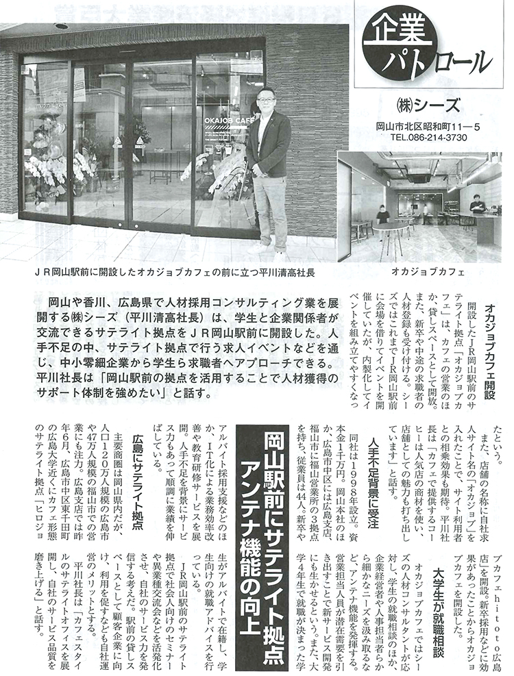 学生と企業関係者が交流できるサテライト拠点をJR岡山駅前に開設した。人手不足の中、サテライト拠点で行う求人イベントなどを通じ、中小零細企業から学生ら求職者へアプローチできる。平川社長は「岡山駅前の拠点を活用することで人材獲得のサポート体制を強めたい」と話す。