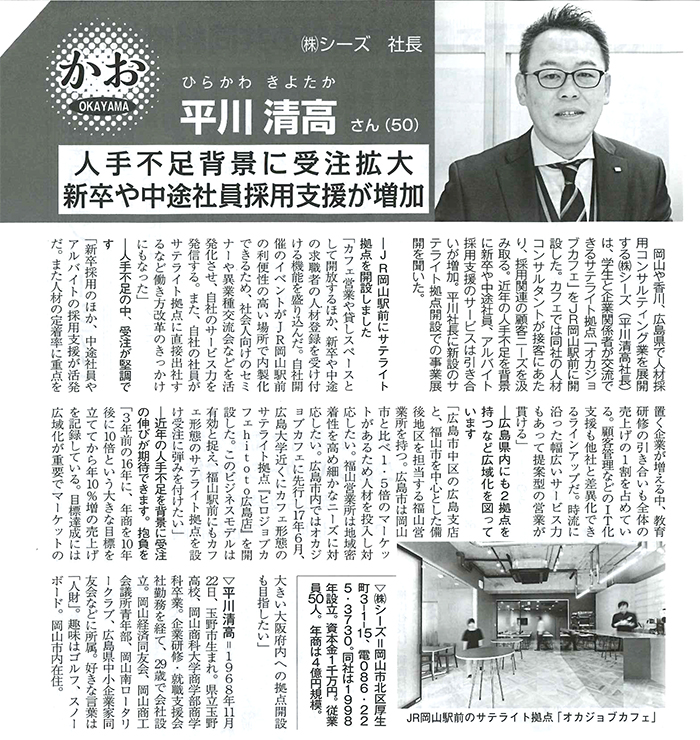 岡山や香川、広島県で人材採用コンサルティング業を展開する(株)シーズ(平川清高社長)は、学生と企業関係者が交流できるサテライト拠点「オカジョブカフェ」をJR岡山駅前に開設した。カフェでは同社の人材コンサルタントが接客にあたり、採用関連の顧客ニーズを汲み取る。近年の人手不足を背景に新卒や中途社員、アルバイト採用支援のサービスは引き合いが増加。平川社長に新設のサテライト拠点開設での事業展開を聞いた。
