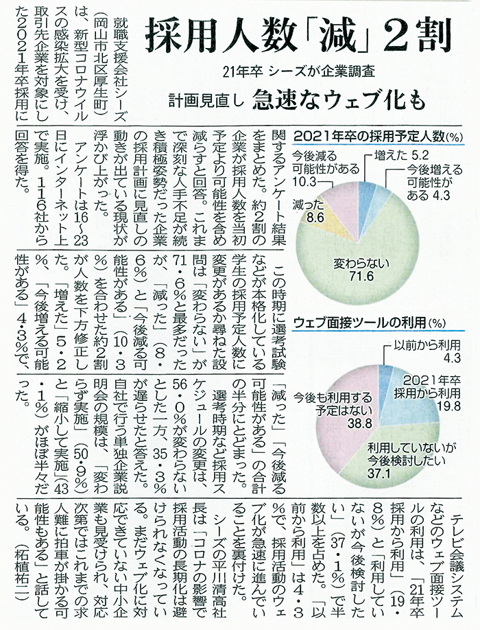 就職支援会社シーズ(岡山市北区厚生町)は、新型コロナウイルスの感染拡大を受け、取引先企業を対象にした2021卒採用に関するアンケート結果をまとめた。約2割の企業が採用人数を当初より可能性を含め減らすと回答。これまで深刻な人手不足が続き積極姿勢だった企業の採用計画に見直しの動きが出ている現状が浮かび上がった。