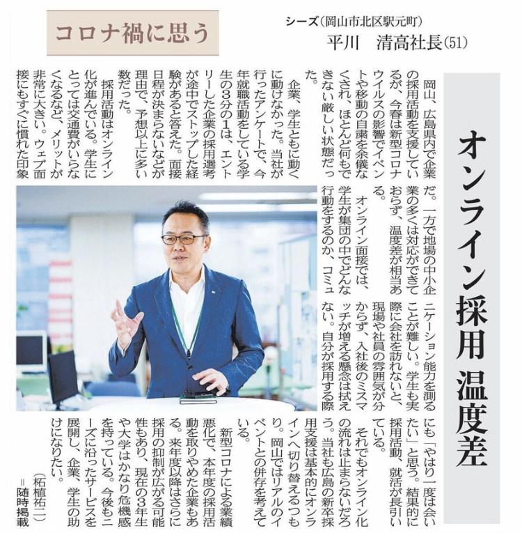 岡山、広島県内で企業の採用活動を支援しているが、今春は新型コロナウイルスの影響でイベントや移動の自粛を余儀なくされ、ほとんど何もできない厳しい状態だった。