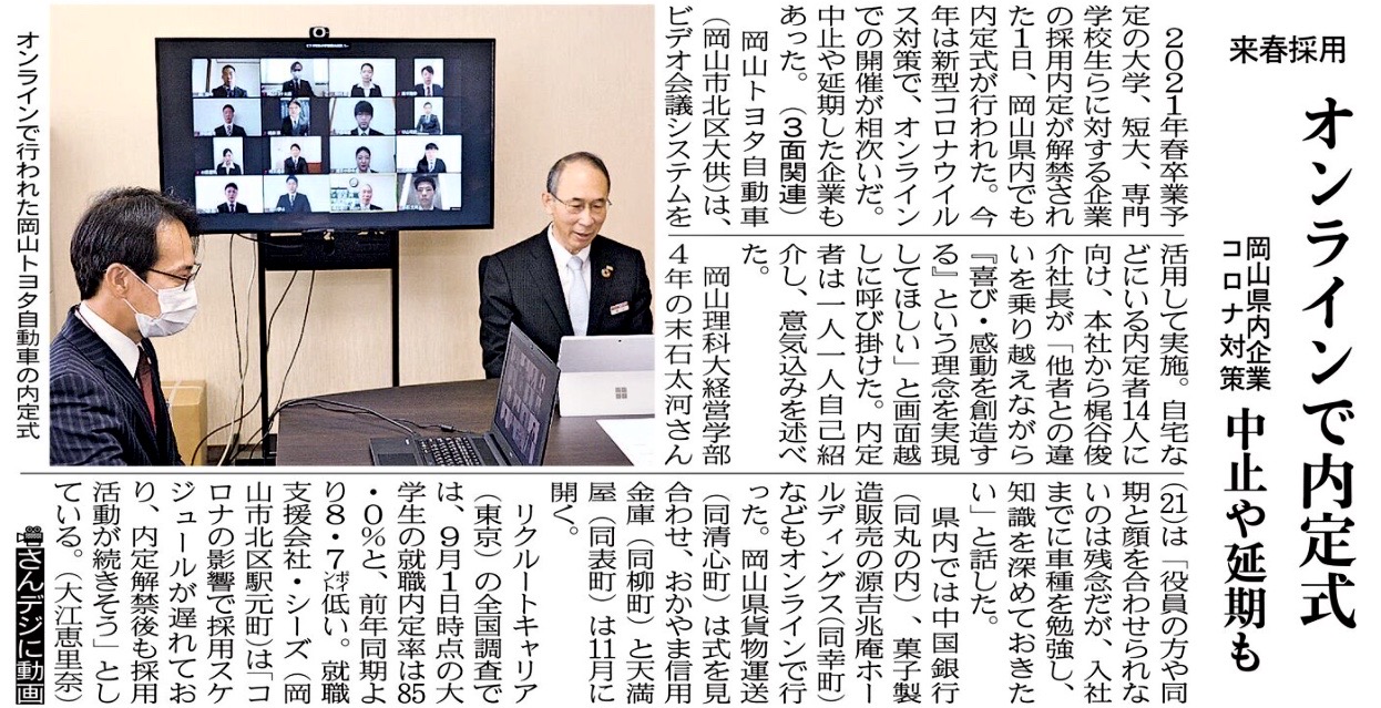 2021年春卒業予定の大学、短大、専門学校生らに対する企業の採用内定が解禁された1日、岡山県内でも内定式が行われた。今年は新型コロナウイルス対策で、オンラインでの開催が相次いだ。中止や延期した企業もあった。