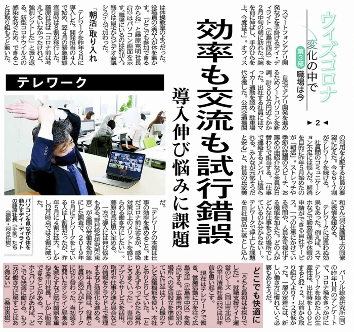 現在はテレワークで働き、営業活動に力を注ぐ広島支店(広島市中区)を拠点にする。広島市内の別の場所への支店設立を準備していた11年はゲーム機のテレビ会議機能を使い、本社とやりとりしていた。「とりあえずやってみたら意外とうまくいった」。専用のアプリやサービスを活用。取引や仕事の進み具合などの情報をクラウド上で管理するなど効率化も進める。