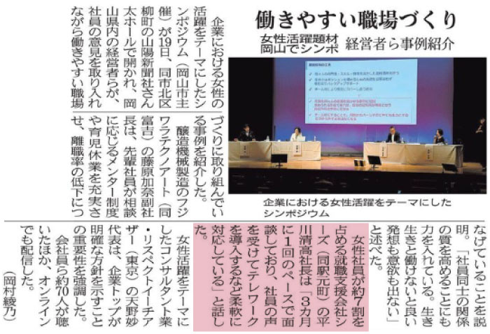 企業における女性の活躍をテーマにしたシンポジウム(岡山市主催)が19日、同市北区柳町の山陽新聞さん太ホールで開かれ、岡山県内の経営者らが、社員の意見を取り入れながら働きやすい職場づくりに取り組んでいる事例を紹介した。