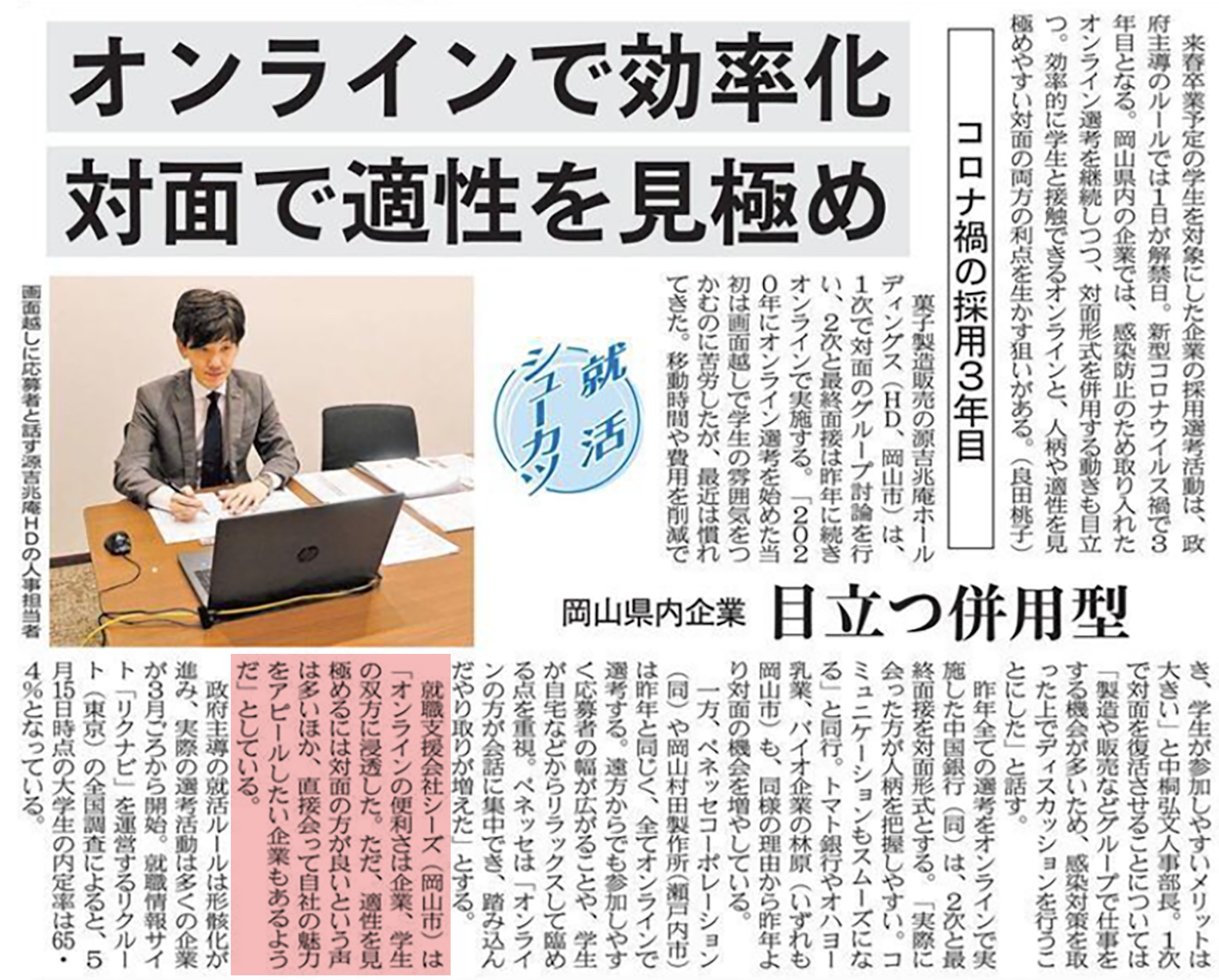 6月1日(水)コロナ禍の採用活動に関する記事に、弊社のコメントが掲載されました。 以下、抜粋 ======================就職支援会社シーズ(岡山市)は「オンラインの便利さは企業、学生の双方に浸透した。ただ、適性を見極めるには対面の方が良いという声は多いほか、直接会って自社の魅力をアピールしたい企業もあるようだ」としている。 ====================== ※山陽新聞 2022年6月1日