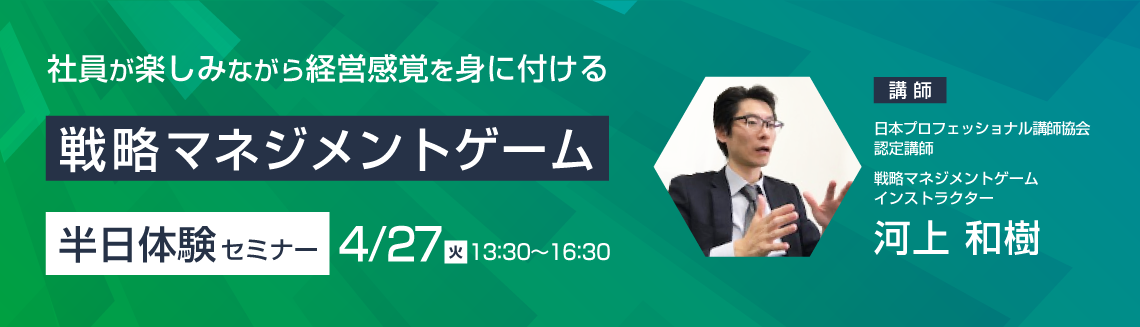 | 講師 | 河上 和樹(日本プロフェッショナル講師協会 認定講師・戦略マネジメントゲーム インストラクター) |
