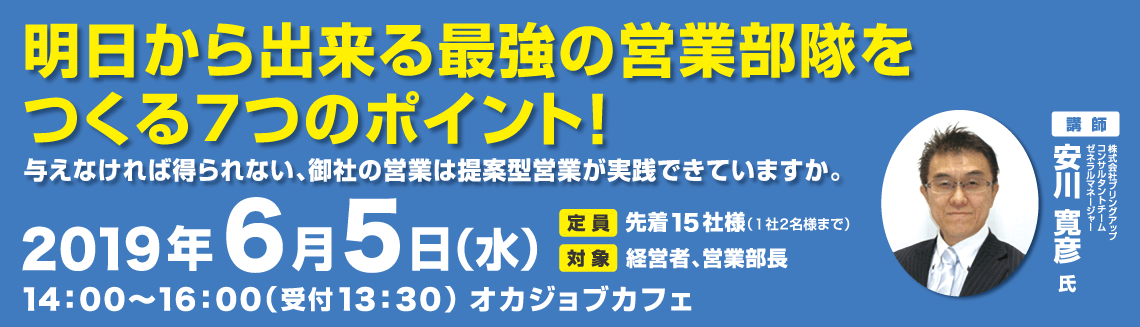 | 講師 | 安川 寛彦 (やすかわひろひこ) 株式会社ブリングアップ コンサルタントチーム:ゼネラルマネージャー 大手メーカー、教育会社、生命保険会社を経て現在に至る。 豊富なマネジメント経験から、全ての業界で成果を創出できる営業マネジャーの育成を得意とする。 自らもトップセールスマンとして活躍中。 |