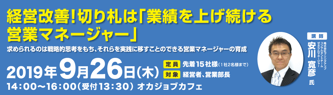 | 講師 | 安川 寛彦 (やすかわひろひこ) 株式会社ブリングアップ コンサルタントチーム:ゼネラルマネージャー 大手メーカー、教育会社、生命保険会社を経て現在に至る。 豊富なマネジメント経験から、全ての業界で成果を創出できる営業マネジャーの育成を得意とする。 自らもトップセールスマンとして活躍中。 |